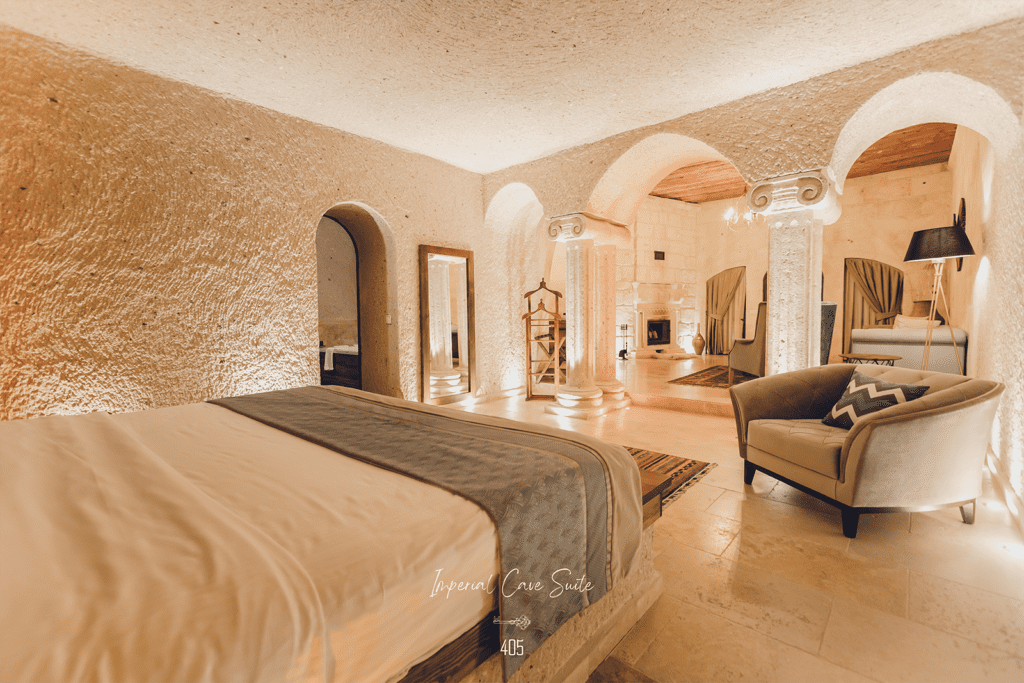 Nino’nun en büyük mağara süitlerinden biri! Kalabalık gruplar ve aileler için ideal. Terasınızda İbrahimpaşa Vadisi manzaralı bir masanız var. Süitin sıcaklığına açılan bir banyo duvarına sahip güzel bir jakuzi. Şömine başında geniş bir oturma alanı. Yatağınızın arkasında “Zeus’un Titanlar ile savaşı” size eşlik ediyor. Her şeyin tadını çıkarın!
